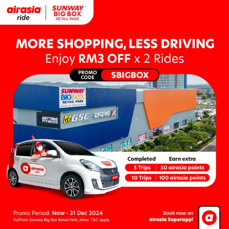Travel here and save more with AirAsia Move when you book a ride to from Sunway Big Box Retail Park & Sunway Citrine Hub! 🚗 Enjoy up to RM3 off for 2x rides using AirAsia MOVE