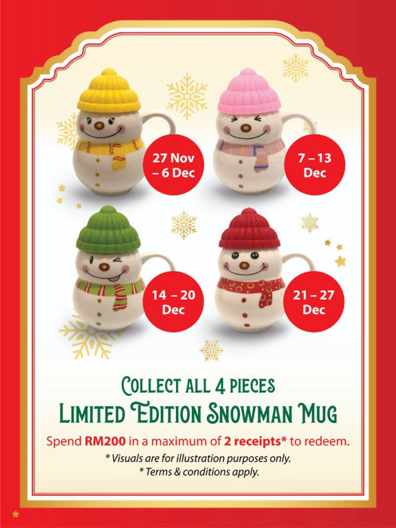 Shop for your festive essentials🎄 and redeem a Limited-Edition Snowman Mug when you spend RM200 in a maximum of 2 receipts!😮