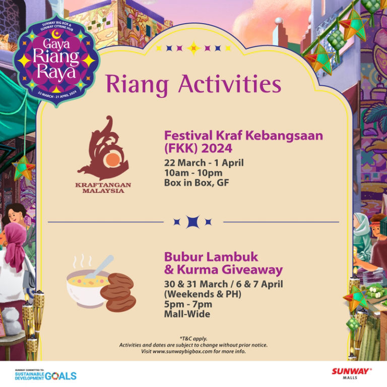 Not only that, don't forget to also participate in the Festival Kraf Kebangsaan and keep an eye out for our delightful Bubur Lambuk & Kurma Giveaway. While you are here, be captivated by our delightful Raya Dance Performance, partake in our Raya Cookies Giveaway, and unleash your creativity at our DIY Workshop 🎨