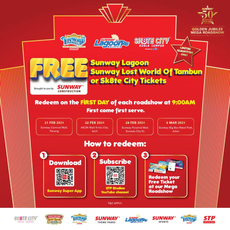 Be at our Sunway Golden Jubilee Mega Roadshow, 9AM for an exclusive treat - a FREE ADMISSION TICKET 🎟️ to Sunway Lagoon, @sunwaylostworldoftambun or @sk8tecitymalaysia! 🤩