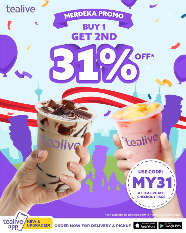 Get a 31% discount on your 2nd drink (priced at RM10 or below) when you enter promo code MY31 on your Tealive app!​