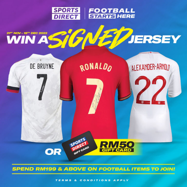 Stand a chance to win a Signed Jersey by Cristiano Ronaldo, Kevin De Bruyne & Trent Alexander-Arnold or RM50 Sports Direct Gift Card.