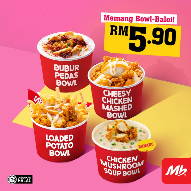 Discover irresistible Memang Bowl-Baloi meals for only RM5.90! 🌟Enjoy the tasty selection such as new Chicken Mushroom Soup Bowl, Bubur Pedas Bowl, Loaded Potato Bowl, and Cheesy Chicken Mashed Bowl. Great for a quick bite on-the-go or to add-on more value to your amazing Marrybrown meals! Get your bowl today at your nearest Marrybrown outlet!
