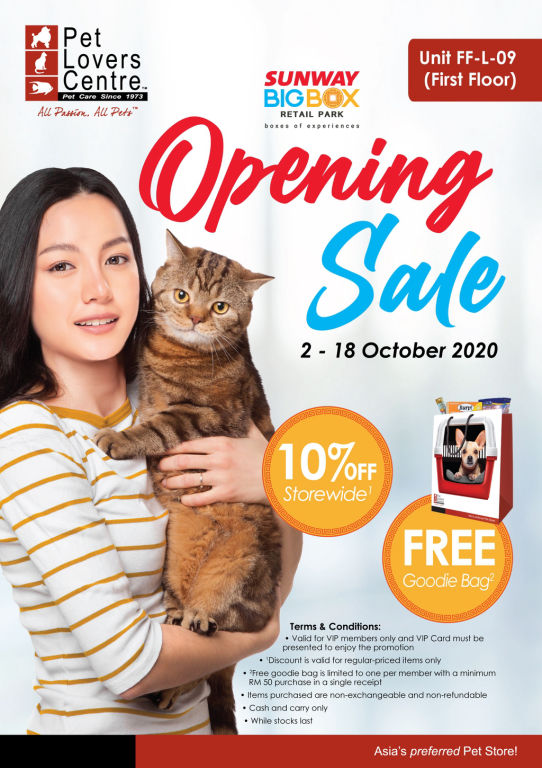 Our latest Pet Lovers Centre Malaysia store will officially open for business, here at Sunway Big Box Retail Park on the 2nd of Oct! Come and join us at our opening as VIP members get to enjoy a 10% discount storewide, plus a *free goodie bag when you spend at least RM50 on a single receipt.