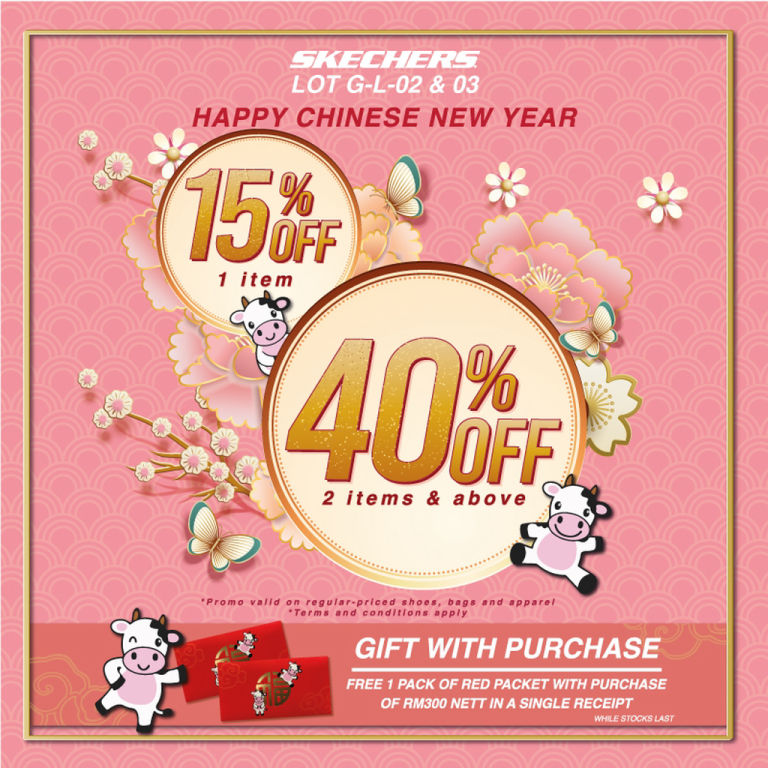 Usher in the Chinese Niu Year with Skechers! Buy 1 item at 15% OFF, or buy 2 items and above at 40% OFF! Valid from now until 28th Feb 2021, T&Cs apply #SkechersMY