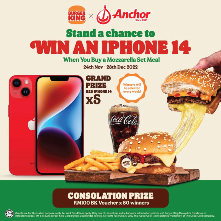 5 apples are ready to be harvested. Order Mozzarella King burgers and stand a chance to win a red iPhone 14. It only takes 4 simple steps. See the details below to know more. T&C apply. #BurgerKingMY